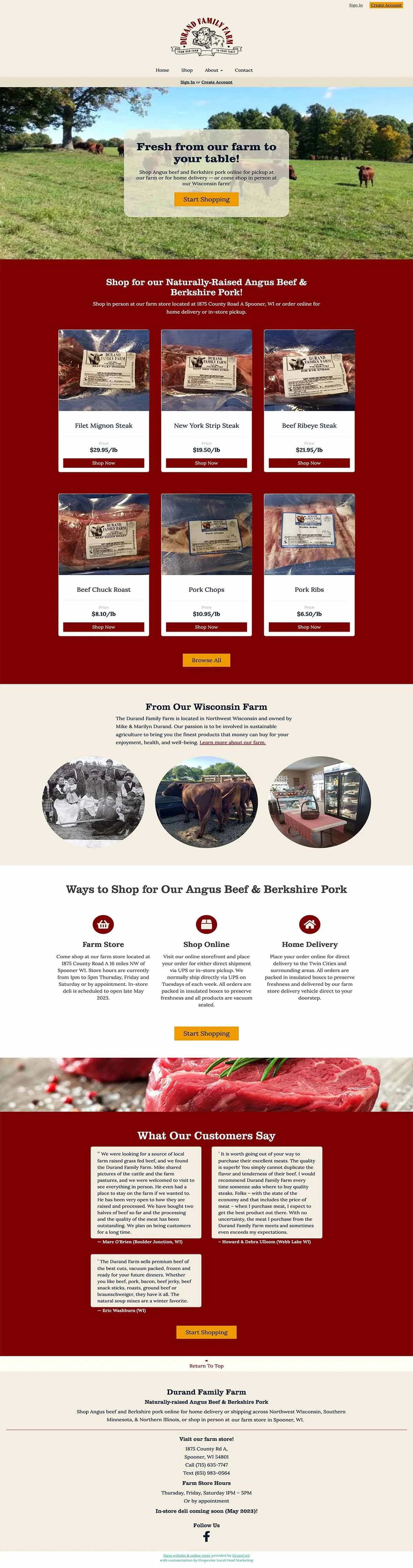 We redesigned Durand Family Farms’ GrazeCart website to align with the established brand of this Wisconsin beef and pork farm. We customized the colors and fonts, added new sections to the home page, and created a polished, engaging layout.